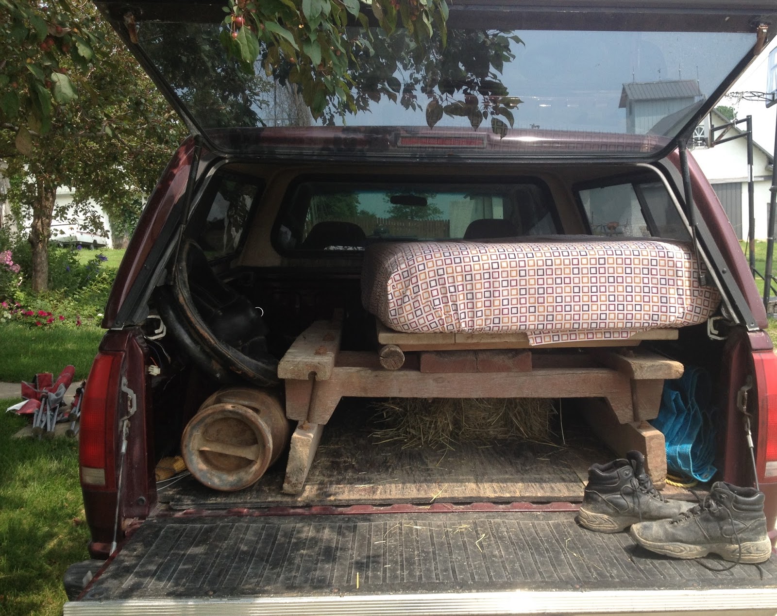 My pickup topper has two small screen windows for ventilation. I drifted off to sleep to the sound of Amish teens laughing and visiting quietly. Every now and then, I would wake to the sound of a horse whinnying to their teenage owner, "Don't forget me... I'm still here!" One by one, horses trotted off into the dark night. You can see my camper below. I use a bob-sled for my book-selling table. My horse collars and hay-bales for decor. I not only had the sound of hoof-beats as music, but the smell of hay and harness leather for effect.