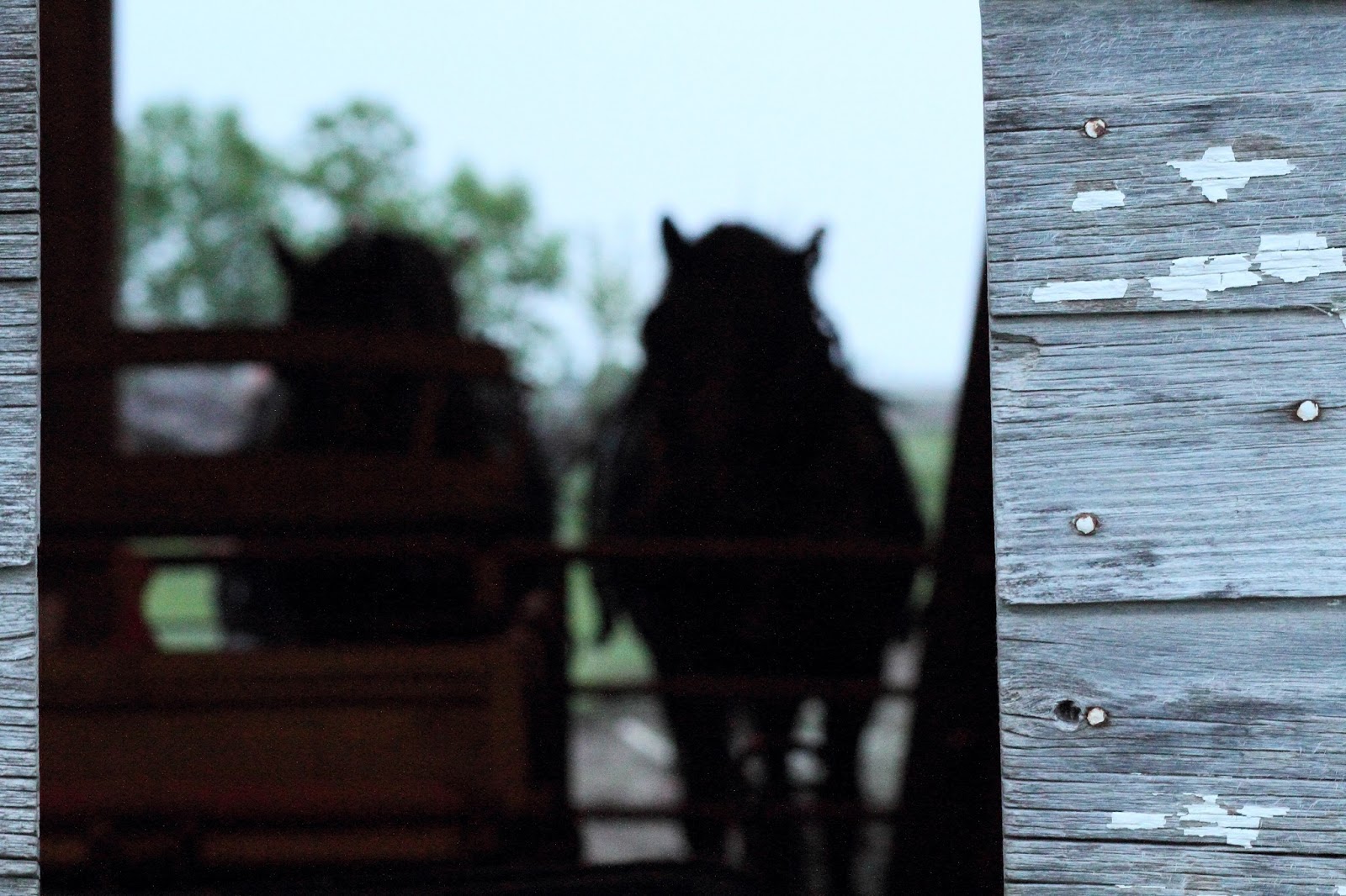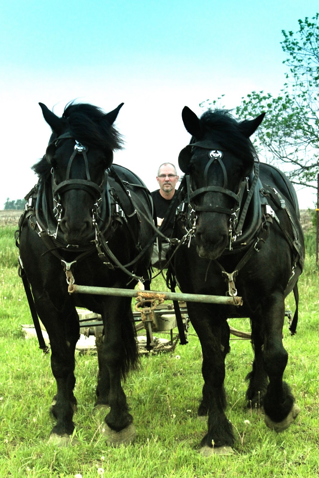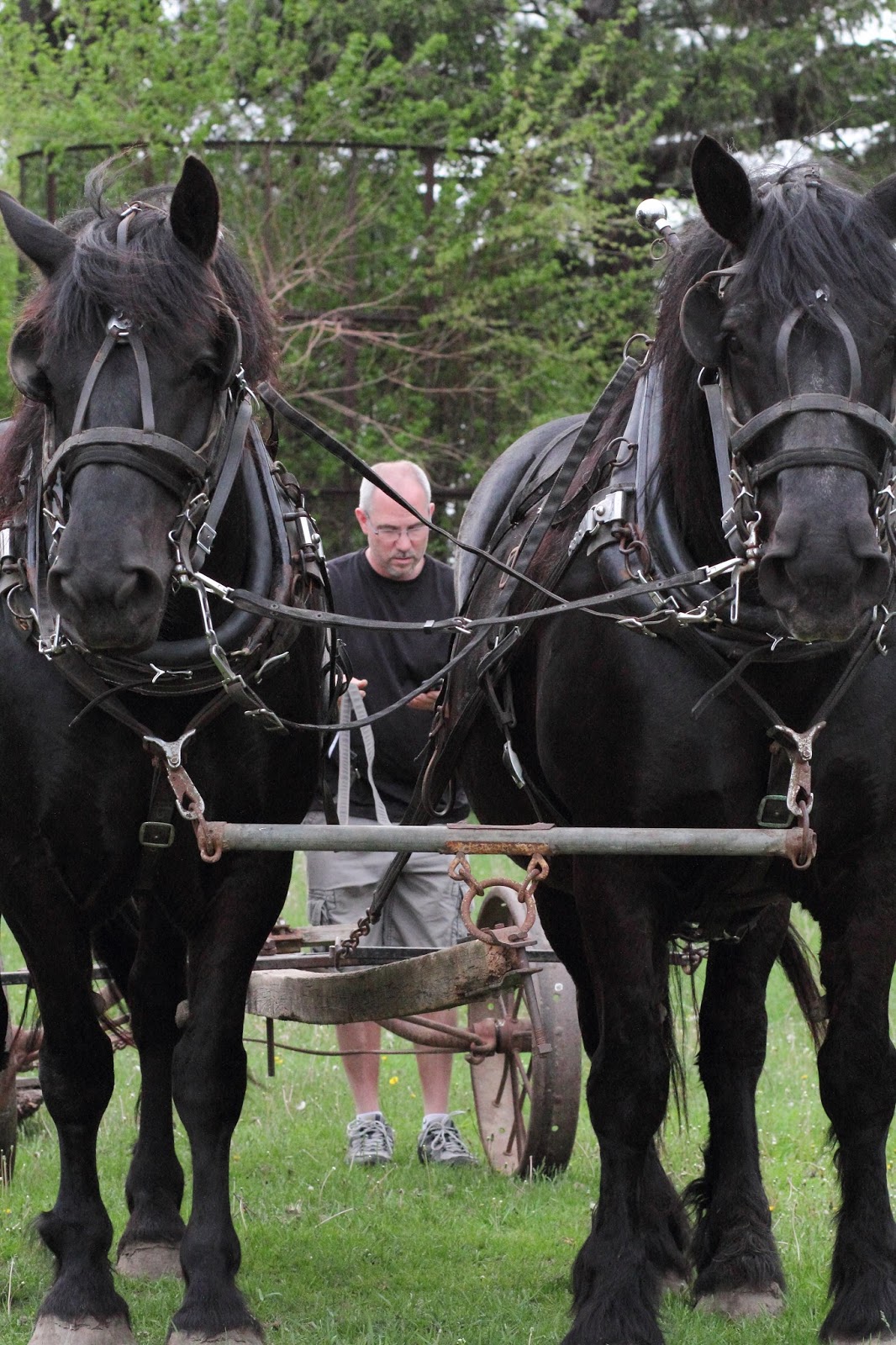Only too happy to show me the horses again, Virgil slid open a large door and the line of big black horses clomped into their stalls and calmly let the young man put on their halters and tie them. I asked if we could take the two mares I was thinking about buying, outside, so I could see them in full daylight...