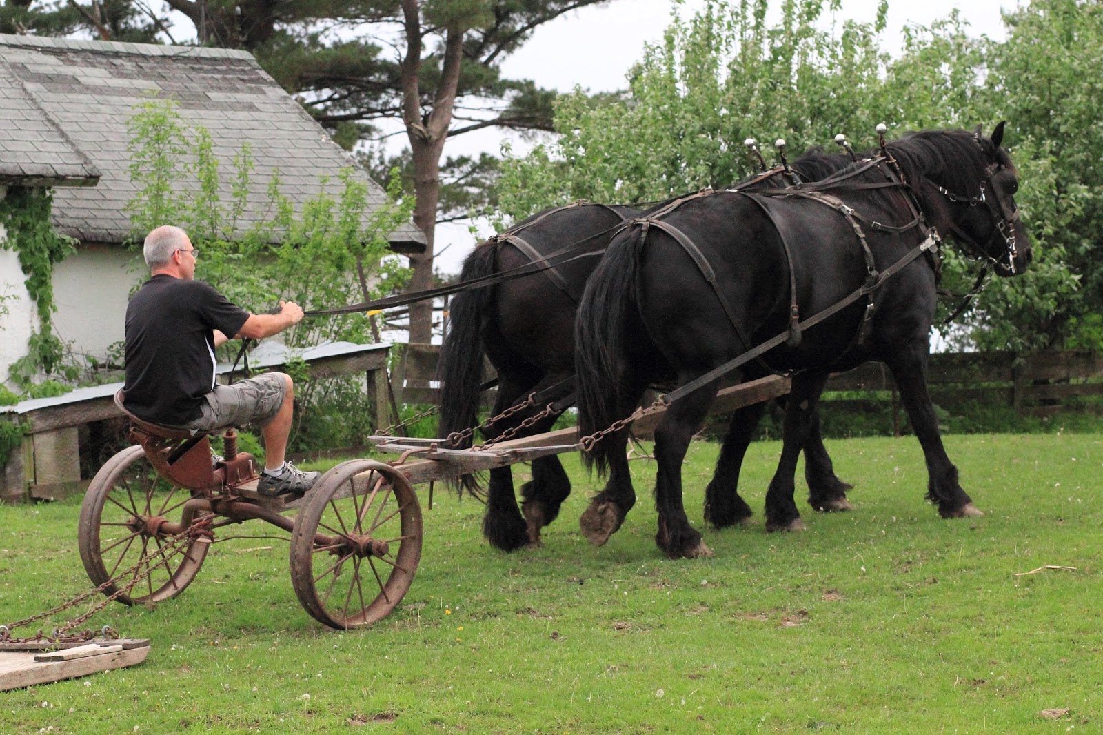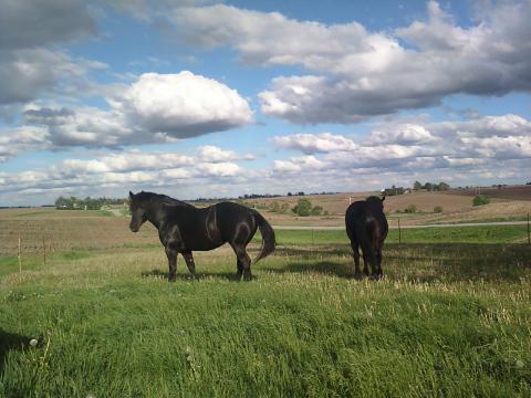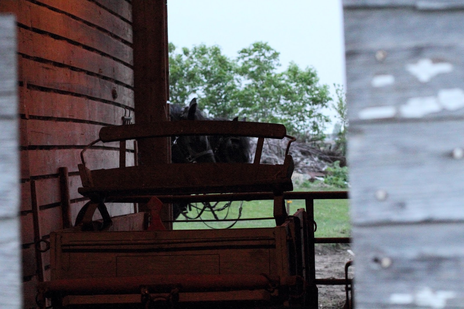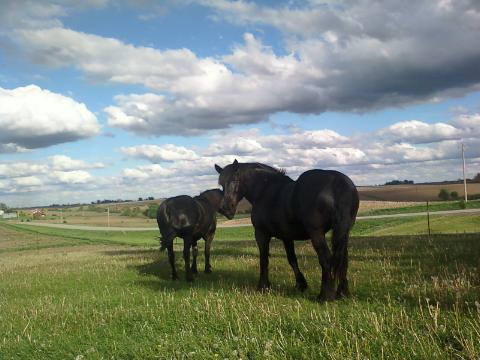 Only too happy to show me the horses again, Virgil slid open a large door and the line of big black horses clomped into their stalls and calmly let the young man put on their halters and tie them. I asked if we could take the two mares I was thinking about buying, outside, so I could see them in full daylight...