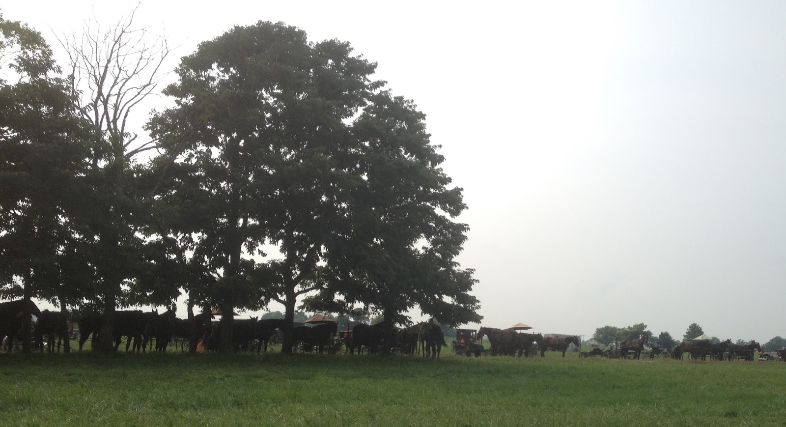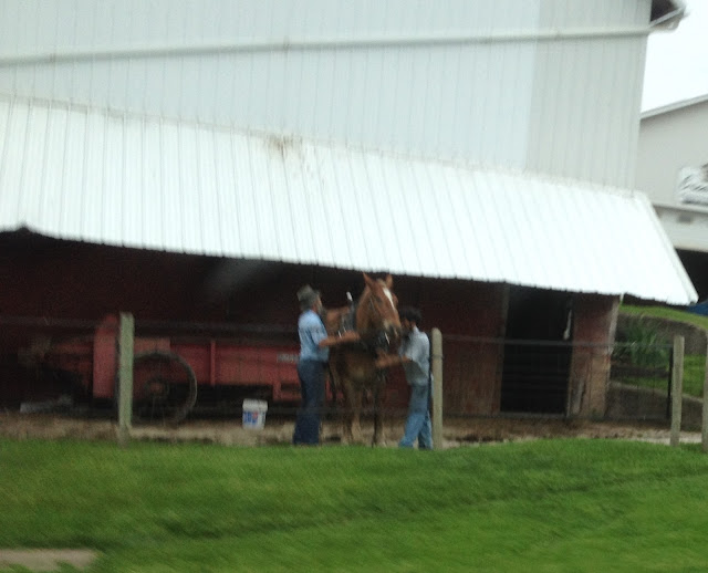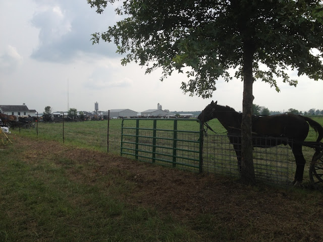 I stopped to take a picture of this herd of Amish draft horses (above) and a boy came around the corner of their buggy shed, riding a pony. (If you zoom in close you can almost see him) I can't help but think that his whole world is about horses. Obviously his dad farms with horses, they drive horses on the buggy, and he rides a pony for entertainment in the evening.