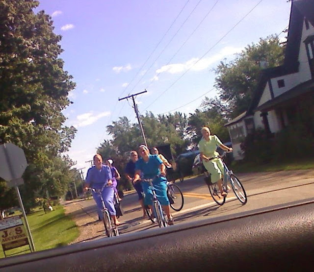 This photo is not only blurry, but crooked. These girls stopped at a four-way intersection and waited for me to go. I waved and they all waved back. I was hoping to catch their friendly gesture, but it didn't work out that way. I was also hoping that the buggy disappearing behind them would show up better. Oh well, I'm an author, not a photographer.
